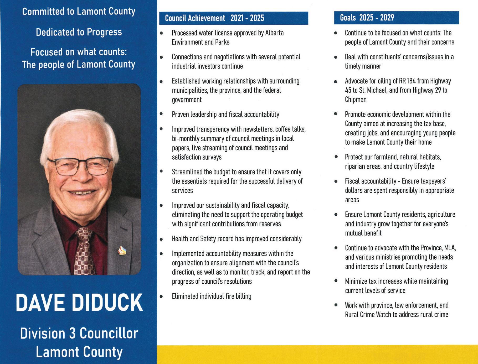 David Diduck, the eight-year councillor for Lamont County’s Division 3, and seven year Reeve of the County, says he feels duty bound to run for reelection.