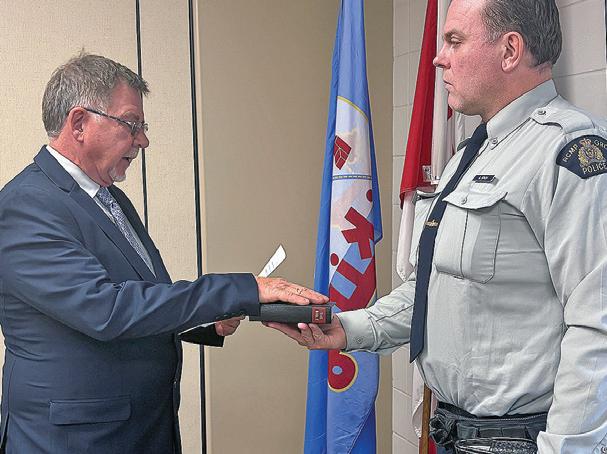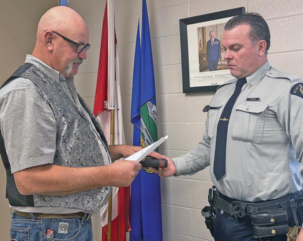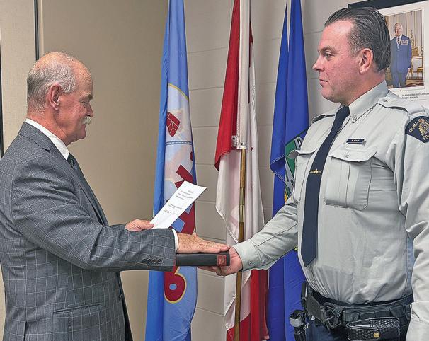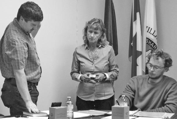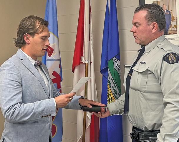 LEFT: The newly elected members to Holden Village Council were sworn in on Monday, Oct. 27 in the Council Chambers. L-R: Councillor Alan Ramshaw, Councillor Tammy Hill, Deputy Mayor Tyler Beckett, Councillor Shawn Cole, Mayor Carl Marsh. ABOVE: Mayor Carl Marsh reads the official oath of office.