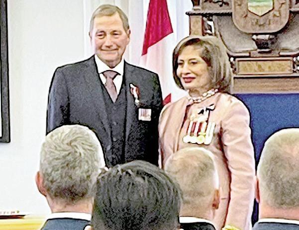 stands with Alberta Lieutenant Governor Salma Lakhain after being presented with a king Charles III coronation medal last week at Alberta Government House.