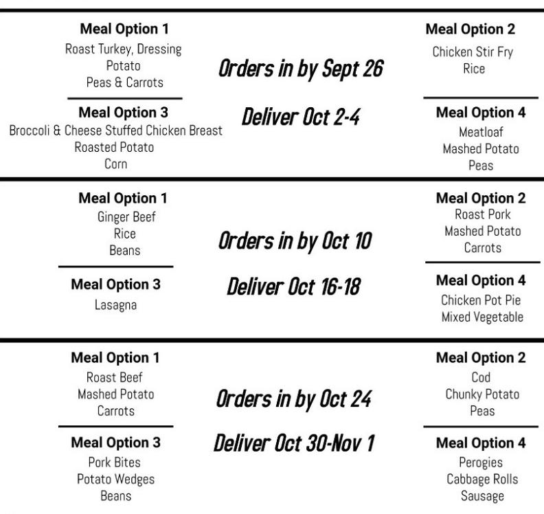 4. Meals in Motion: OCTOBER Menu. Call Chrissy to order at 780-975-9592.