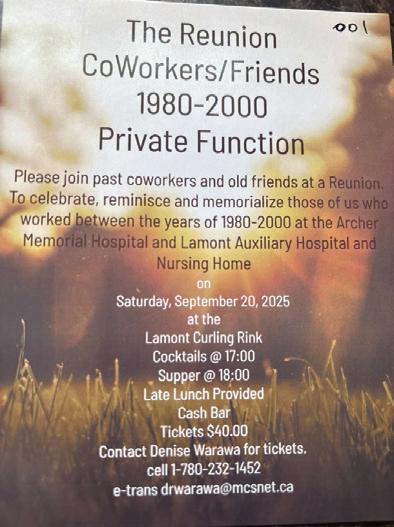 REUNION event and invitation (HOSTED BY SHAWN SADOWAY) – (Coworkers, old friends from between 1980-2000 Archer Memorial Hospital, Lamont Aux. Hospital & Nursing Home). Sept. 2. Contact Denise W. for tix./ details: 780-232-1452 & drwarawa@mcsnet.ca