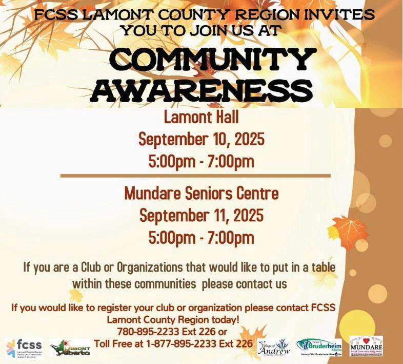 Community Connect & Learn – FCSS EVENT: Oct. 23 from 9 a.m. to 4 p.m. in Manville. The 2025 Non-Profit Conference. To attend this FREE event, register with FCSS by Oct. 10. Learn more at lamontcounty.ca/community-programming