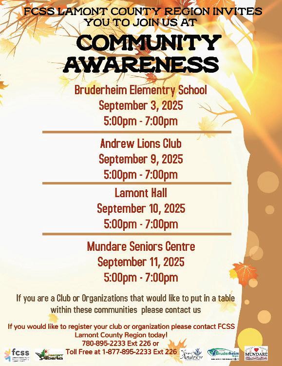 1. FCSS: Parents and Tots is looking for parent volunteers to assist with its programs. Contact Community Services for more information or to sign up to assist. The Lamont program starts Sept. 8. 2. Community Awareness Nights – in September (see the poster below).