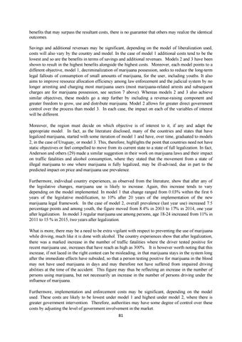 benefits that may surpass the resultant costs, there is no guarantee that others may realize the identical outcomes. Savings and additional revenues may be significant, depending on the model of liberalization used, costs will also vary by the country and model. In the case of model 1 additional costs tend to be the lowest and so are the benefits in terms of savings and additional revenues. Models 2 and 3 have been shown to result in the highest benefits alongside the highest costs. Moreover, each model points to a different objective, model 1, decriminalization of marijuana possession, seeks to reduce the long-term legal fallouts of consumption of small amounts of marijuana, for the user, including youths. It also aims to improve resource allocation efficiency among law enforcement and the judicial system by no longer arresting and charging most marijuana users (most marijuana-related arrests and subsequent charges are for marijuana possession, see section 7 above). Whereas models 2 and 3 also achieve similar objectives, these models go a step further by including a revenue-raising component and greater freedom to grow, use and distribute marijuana. Model 2 allows for greater direct government control over the process than model 3. In each case, the impact on each of the variables of interest will be different. Moreover, the region must decide on which objective is of interest to it, if any and adapt the appropriate model. In fact, as the literature disclosed, many of the countries and states that have legalized marijuana, started with some iteration of model 1 and have, over time, graduated to models 2, in the case of Uruguay, or model 3. This, therefore, highlights the point that countries need not have static objectives or feel compelled to move from its current state to a state of full legalization. In fact, Anderson and others (29) made a similar suggestion in their work on marijuana laws and their impact on traffic fatalities and alcohol consumption, where they stated that the movement from a state of illegal marijuana to one where marijuana is fully legalized, may be ill-advised, due in part to the predicted impact on price and marijuana use prevalence. Furthermore, individual country experiences, as observed from the literature, show that after any of the legislative changes, marijuana use is likely to increase. Again, this increase tends to vary depending on the model implemented. In model 1 that change ranged from 0.03% within the first 6 years of the legislative modification, to 10% after 20 years of the implementation of the new marijuana legal framework. In the case of model 2, overall prevalence (last year use) increased 7.5 percentage points and among youth, the figure moved from 8.4% in 2003 to 17% in 2014, one year after legalization. In model 3 regular marijuana use among persons, age 18-24 increased from 11% in 2011 to 15 % in 2015, two years after legalization. What is more, there may be a need to be extra vigilant with respect to preventing the use of marijuana while driving, much like it is done with alcohol. The country experiences show that after legalization, there was a marked increase in the number of traffic fatalities where the driver tested positive for recent marijuana use, increases that have reach as high as 300%. It is however worth noting that this increase, if not laced in the right contest can be misleading, in that marijuana stays in the system long after the immediate effects have subsided, so that a person testing positive for marijuana in the blood may not have used marijuana in days and may therefore not have suffered from impaired driving abilities at the time of the accident. This figure may thus be reflecting an increase in the number of persons using marijuana, but not necessarily an increase in the number of persons driving under the influence of marijuana. Furthermore, implementation and enforcement costs may be significant, depending on the model used. These costs are likely to be lowest under model 1 and highest under model 2, where there is greater government intervention. Therefore, authorities may have some degree of control over these costs by adjusting the level of government involvement in the market. 81