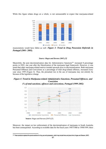 Meanwhile, the post decriminalization data for Administrative Sanctions241 increased 8 percentage points in 2002, one year after the liberalization of the marijuana legal framework. However, it was noted that other marijuana-related metrics trended upwards prior to decriminalization. Both marijuana Presumed Offences and Convictions as a percentage of total drug-related offences, increased every year since 1999 (Figure 4). Thus, the presumed rise in the use of marijuana may not entirely be because of the legislative change.