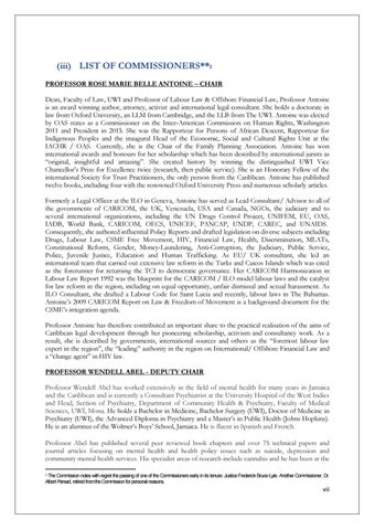 (iii) LIST OF COMMISSIONERS**1 PROFESSOR ROSE MARIE BELLE ANTOINE – CHAIR Dean, Faculty of Law, UWI and Professor of Labour Law & Offshore Financial Law, Professor Antoine is an award winning author, attorney, activist and international legal consultant. She holds a doctorate in law from Oxford University, an LLM from Cambridge, and the LLB from The UWI. Antoine was elected by OAS states as a Commissioner on the Inter-American Commission on Human Rights, Washington 2011 and President in 2015. She was the Rapporteur for Persons of African Descent, Rapporteur for Indigenous Peoples and the inaugural Head of the Economic, Social and Cultural Rights Unit at the IACHR / OAS. Currently, she is the Chair of the Family Planning Association. Antoine has won international awards and honours for her scholarship which has been described by international jurists as “original, insightful and amazing”. She created history by winning the distinguished UWI Vice Chancellor’s Prize for Excellence twice (research, then public service). She is an Honorary Fellow of the international Society for Trust Practitioners, the only person from the Caribbean. Antoine has published twelve books, including four with the renowned Oxford University Press and numerous scholarly articles. Formerly a Legal Officer at the ILO in Geneva, Antoine has served as Lead Consultant/ Advisor to all of the governments of CARICOM, the UK, Venezuela, USA and Canada, NGOs, the judiciary and to several international organizations, including the UN Drugs Control Project, UNIFEM, EU, OAS, IADB, World Bank, CARICOM, OECS, UNICEF, PANCAP, UNDP, CAREC, and UNAIDS. Consequently, she authored influential Policy Reports and drafted legislation on diverse subjects including Drugs, Labour Law, CSME Free Movement, HIV, Financial Law, Health, Discrimination, MLATs, Constitutional Reform, Gender, Money-Laundering, Anti-Corruption, the Judiciary, Public Service, Police, Juvenile Justice, Education and Human Trafficking. As EU/ UK consultant, she led an international team that carried out extensive law reform in the Turks and Caicos Islands which was cited as the forerunner for returning the TCI to democratic governance. Her CARICOM Harmonization in Labour Law Report 1992 was the blueprint for the CARICOM / ILO model labour laws and the catalyst for law reform in the region, including on equal opportunity, unfair dismissal and sexual harassment. As ILO Consultant, she drafted a Labour Code for Saint Lucia and recently, labour laws in The Bahamas. Antoine’s 2009 CARICOM Report on Law & Freedom of Movement is a background document for the CSME’s integration agenda. Professor Antoine has therefore contributed an important share to the practical realisation of the aims of Caribbean legal development through her pioneering scholarship, activism and consultancy work. As a result, she is described by governments, international sources and others as the “foremost labour law expert in the region”, the “leading” authority in the region on International/ Offshore Financial Law and a “change agent” in HIV law. PROFESSOR WENDELL ABEL - DEPUTY CHAIR Professor Wendell Abel has worked extensively in the field of mental health for many years in Jamaica and the Caribbean and is currently a Consultant Psychiatrist at the University Hospital of the West Indies and Head, Section of Psychiatry, Department of Community Health & Psychiatry, Faculty of Medical Sciences, UWI, Mona. He holds a Bachelor in Medicine, Bachelor Surgery (UWI), Doctor of Medicine in Psychiatry (UWI), the Advanced Diploma in Psychiatry and a Master’s in Public Health (Johns Hopkins). He is an alumnus of the Wolmer’s Boys’ School, Jamaica. He is fluent in Spanish and French. Professor Abel has published several peer reviewed book chapters and over 75 technical papers and journal articles focusing on mental health and health policy issues such as suicide, depression and community mental health services. His specialist areas of research include cannabis and he has been at the The Commission notes with regret the passing of one of the Commissioners early in its tenure: Justice Frederick Bruce-Lyle. Another Commissioner, Dr. Albert Persad, retired from the Commission for personal reasons. 1