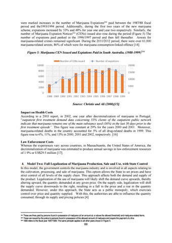Source: Christie and Ali (2000)[15]. Impact on Health Costs According to a 2003 report, in 2002, one year after decriminalization of marijuana in Portugal, “outpatient first treatment demand data concerning 53% clients of the outpatient public network indicate that marijuana remains one of the main substance used (36%) in the last 30 days prior to the first treatment episode�. This figure was constant at 29% for the years 2000 and 2001. Moreover, marijuana-related deaths in the country accounted for 5% of all drug-related deaths in 1999. This figure rose to 6%, 11%, and 13% in 2000, 2001 and 2002, respectively. [16] Law Enforcement Costs Whereas the experiences vary across countries, in Massachusetts, the United States of America, the decriminalization of marijuana was estimated to produce annual savings in law enforcement resources of 1.9% or US$29.5 million [17].