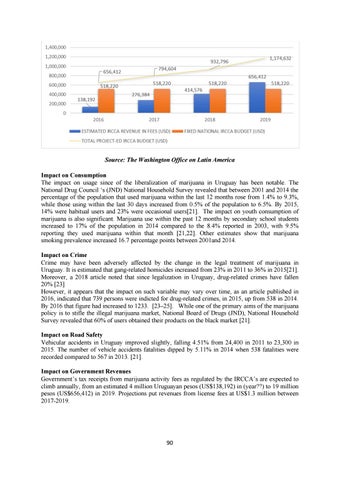 Source: The Washington Office on Latin America Impact on Consumption The impact on usage since of the liberalization of marijuana in Uruguay has been notable. The National Drug Council ‘s (JND) National Household Survey revealed that between 2001 and 2014 the percentage of the population that used marijuana within the last 12 months rose from 1.4% to 9.3%, while those using within the last 30 days increased from 0.5% of the population to 6.5%. By 2015, 14% were habitual users and 23% were occasional users[21]. The impact on youth consumption of marijuana is also significant. Marijuana use within the past 12 months by secondary school students increased to 17% of the population in 2014 compared to the 8.4% reported in 2003, with 9.5% reporting they used marijuana within that month [21,22]. Other estimates show that marijuana smoking prevalence increased 16.7 percentage points between 2001and 2014. Impact on Crime Crime may have been adversely affected by the change in the legal treatment of marijuana in Uruguay. It is estimated that gang-related homicides increased from 23% in 2011 to 36% in 2015[21]. Moreover, a 2018 article noted that since legalization in Uruguay, drug-related crimes have fallen 20% [23] However, it appears that the impact on such variable may vary over time, as an article published in 2016, indicated that 739 persons were indicted for drug-related crimes, in 2015, up from 538 in 2014. By 2016 that figure had increased to 1233. [23–25]. While one of the primary aims of the marijuana policy is to stifle the illegal marijuana market, National Board of Drugs (JND), National Household Survey revealed that 60% of users obtained their products on the black market [21]. Impact on Road Safety Vehicular accidents in Uruguay improved slightly, falling 4.51% from 24,400 in 2011 to 23,300 in 2015. The number of vehicle accidents fatalities dipped by 5.11% in 2014 when 538 fatalities were recorded compared to 567 in 2013. [21]. Impact on Government Revenues Government’s tax receipts from marijuana activity fees as regulated by the IRCCA’s are expected to climb annually, from an estimated 4 million Uruguayan pesos (US$138,192) in (year??) to 19 million pesos (US$656,412) in 2019. Projections put revenues from license fees at US$1.3 million between 2017-2019.