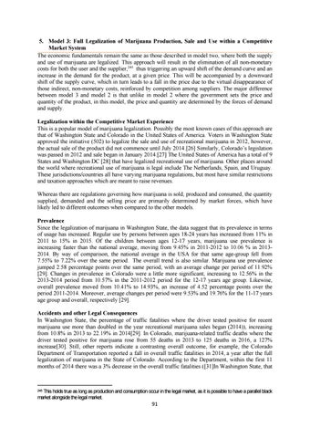 5. Model 3: Full Legalization of Marijuana Production, Sale and Use within a Competitive Market System The economic fundamentals remain the same as those described in model two, where both the supply and use of marijuana are legalized. This approach will result in the elimination of all non-monetary costs for both the user and the supplier,245 thus triggering an upward shift of the demand curve and an increase in the demand for the product, at a given price. This will be accompanied by a downward shift of the supply curve, which in turn leads to a fall in the price due to the virtual disappearance of those indirect, non-monetary costs, reinforced by competition among suppliers. The major difference between model 3 and model 2 is that unlike in model 2 where the government sets the price and quantity of the product, in this model, the price and quantity are determined by the forces of demand and supply. Legalization within the Competitive Market Experience This is a popular model of marijuana legalization. Possibly the most known cases of this approach are that of Washington State and Colorado in the United States of America. Voters in Washington State approved the initiative (502) to legalize the sale and use of recreational marijuana in 2012, however, the actual sale of the product did not commence until July 2014.[26] Similarly, Colorado’s legislation was passed in 2012 and sale began in January 2014.[27] The United States of America has a total of 9 States and Washington DC [28] that have legalized recreational use of marijuana. Other places around the world where recreational use of marijuana is legal include The Netherlands, Spain, and Uruguay. These jurisdictions/countries all have varying marijuana regulations, but most have similar restrictions and taxation approaches which are meant to raise revenues. Whereas there are regulations governing how marijuana is sold, produced and consumed, the quantity supplied, demanded and the selling price are primarily determined by market forces, which have likely led to different outcomes when compared to the other models. Prevalence Since the legalization of marijuana in Washington State, the data suggest that its prevalence in terms of usage has increased. Regular use by persons between ages 18-24 years has increased from 11% in 2011 to 15% in 2015. Of the children between ages 12-17 years, marijuana use prevalence is increasing faster than the national average, moving from 9.45% in 2011-2012 to 10.06 % in 20132014. By way of comparison, the national average in the USA for that same age-group fell from 7.55% to 7.22% over the same period. The overall trend is also similar. Marijuana use prevalence jumped 2.58 percentage points over the same period, with an average change per period of 11.92% [29]. Changes in prevalence in Colorado were a little more significant; increasing to 12.56% in the 2013-2014 period from 10.57% in the 2011-2012 period for the 12-17 years age group. Likewise, overall prevalence moved from 10.41% to 14.93%, an increase of 4.52 percentage points over the period 2011-2014. Moreover, average changes per period were 9.53% and 19.76% for the 11-17 years age group and overall, respectively [29]. Accidents and other Legal Consequences In Washington State, the percentage of traffic fatalities where the driver tested positive for recent marijuana use more than doubled in the year recreational marijuana sales began (2014)), increasing from 10.8% in 2013 to 22.19% in 2014[29]. In Colorado, marijuana-related traffic deaths where the driver tested positive for marijuana rose from 55 deaths in 2013 to 125 deaths in 2016, a 127% increase[30]. Still, other reports indicate a contrasting overall outcome, for example, the Colorado Department of Transportation reported a fall in overall traffic fatalities in 2014, a year after the full legalization of marijuana in the State of Colorado. According to the Department, within the first 11 months of 2014 there was a 3% decrease in the overall traffic fatalities ([31]In Washington State, that