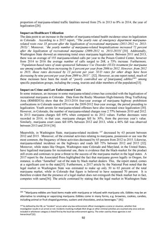 proportion of marijuana-related traffic fatalities moved from 2% in 2013 to 8% in 2014, the year of legalization [26]. Impact on Healthcare Utilization The data point to an increase in the number of marijuana-related health incidence since its legalization in Colorado. According to a 2017 report, “The yearly rate of emergency department marijuanarelated visits rose 35 percent after the legalization of recreational marijuana (2011-2012 vs. 20132015)”. Moreover, “the yearly number of marijuana-related hospitalizations increased 72 percent after the legalization of recreational marijuana (2009-2012 vs. 2013-2015)”.[30]. Additionally, Washington State showed an interesting trend since marijuana legalization. Between 2011 and 2013, there was an average of 155 marijuana-related calls per year to the Poison Control Center, however from 2014 to 2016 the average number of calls surged to 268, a 73% increase. Furthermore, “Population-based rates of state-sponsored Substance Use Disorder (SUD) treatment for marijuana use among youths had been increasing by 5 percent per year from 2006 to 2012. However, from 2012 to 2015, those rates decreased by 13 percent per year. SUD rates for other drugs have been decreasing by nine percent per year from 2009 to 2015”. [32]. However, as one report noted, much of these increases have been the result of “poorly controlled use of [marijuana] edibles246” among specific population groups, including the young, tourists and older members of the population[33]. Impact on Crime and Law Enforcement Costs In some instances, an increase in some marijuana-related crimes has coincided with the legalization of recreational marijuana in Colorado. Data from the Rocky Mountain High-Intensity Drug Trafficking Area (RMHIDTA) show that the 2013-2016 four-year average of marijuana highway prohibition confiscations in Colorado soared 43% over the 2009-2012 four-year average, the period preceding to legalization. Youth arrests for marijuana-related offences have also increased since legalization [30]. However, in Colorado, the number of marijuana-related charges rose 2.77% between 2010 and 2012. In 2013 marijuana charges fell 69% when compared to its 2012 values. Further decreases were recorded in 2014; in that year, marijuana charges fell by 30%, from the previous year’s value. Similarly, marijuana court cases fell 69% between 2012 and 2013, while a 46% fall was observed between 2013 and 2014 [34]. Meanwhile, in Washington State, marijuana-related incidents 247 decreased by 63 percent between 2012 and 2015. Moreover, of the criminal activities relating to marijuana, possession or use was the most common, the frequency of these activities decreased by 65 percent from 2012 to 2015. Likewise, marijuana-related incidence on the highways and roads fell 75% between 2012 and 2015 [32]. Moreover, while states like Oregon, Washington state Colorado and Maryland, in the United States, have legalized marijuana for recreational use, there is evidence that the black-market for the product still exists and continues to pose a threat to the success of the marijuana market in the legal states. A 2017 report by the Associated Press highlighted the fact that marijuana grown legally in Oregon, for instance, is often “funnelled” out of the state by black market dealers. This, the report stated, comes at a significant cost to the state[35]. Furthermore, a 2017 article by the National Post noted that the legal market in Washington State was estimated to make up only 50 to 65 percent of the total marijuana market, while in Colorado that figure is believed to have surpassed 70 percent. It is therefore evident that the presence of a legal market does not extinguish the black market but in fact, competes with same[36]. The article continued by stating that the legal market in Washington State