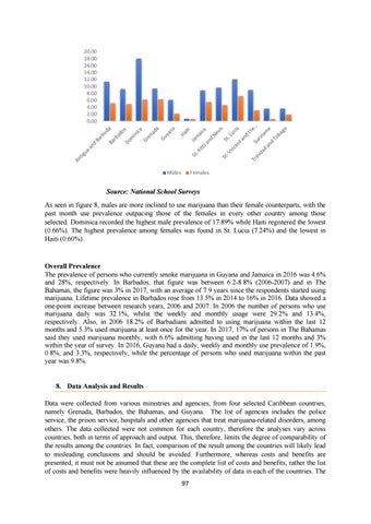 8. Data Analysis and Results Data were collected from various ministries and agencies, from four selected Caribbean countries, namely Grenada, Barbados, the Bahamas, and Guyana. The list of agencies includes the police service, the prison service, hospitals and other agencies that treat marijuana-related disorders, among others. The data collected were not common for each country, therefore the analyses vary across countries, both in terms of approach and output. This, therefore, limits the degree of comparability of the results among the countries. In fact, comparison of the result among the countries will likely lead to misleading conclusions and should be avoided. Furthermore, whereas costs and benefits are presented, it must not be assumed that these are the complete list of costs and benefits, rather the list of costs and benefits were heavily influenced by the availability of data in each of the countries. The 97