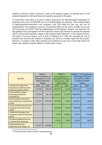 outputs are therefore meant to provide a sense of the potential impact, on selected areas, of the proposed adjustment to the legal framework regarding marijuana in the region. As noted above, since there is no known specific proposal for the legalization/decriminalization of marijuana at the level of CARICOM, the use of models/models was necessary. Three models/models of legalization/decriminalization were examined, with 2018 being the base year and year of implementation, here assigned as year zero. The potential effects on the various variables in year one (2019) and year two (2020)255 after the implementation of the legislative changes, were analyzed. The data gathered were used together with the experiences found in the literature to estimate the potential effects of the possible legislative change to the marijuana legal framework, in the selected countries. The results of previous studies, such as those of Manning et al 1989 who estimated the cost of accidents and external costs relating to marijuana use, served as valuable inputs into this process. Moreover, in instances where these estimates were produced in years prior to the study period, the figures were adjusted, using the inflation, to reflect today’s prices.
