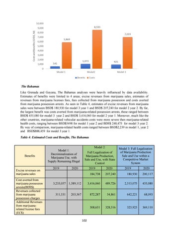 The Bahamas Like Grenada and Guyana, The Bahamas analyses were heavily influenced by data availability. Estimates of benefits were limited to 4 areas; excise revenues from marijuana sales, estimates of revenues from marijuana licenses fees, fees collected from marijuana possession and costs averted from marijuana possession arrests. As seen in Table 4, estimates of excise revenues from marijuana sales were between BSD$ 180,930 for model 3 year 1 and BSD$ 207,240 for model 2 year 2. By far, the largest benefit was costs averted from marijuana-related possession arrests, these ranged between BSD$ 455,080 for model 3 year 2 and BSD$ 3,416,060 for model 2 year 1. Moreover, much like the other countries, marijuana-related vehicular accidents costs were more severe then marijuana-related health costs, ranging between BSD$5498 for model 1 year 2 and BDS$ 248,475 for model 3 year 2. By way of comparison, marijuana-related health costs ranged between BSD$2,239 in model 1, year 2 and BSD$888,459 for model 3 year 1. Table 4: Estimated Costs and Benefits, The Bahamas Model 2: Benefits