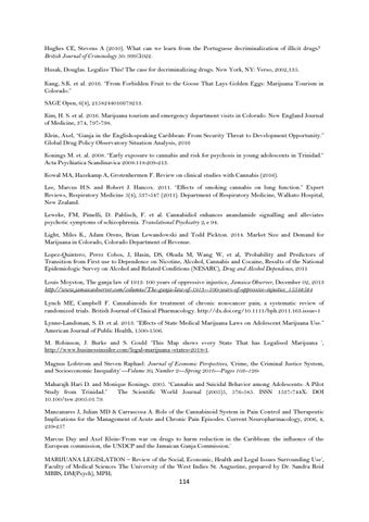 Hughes CE, Stevens A (2010). What can we learn from the Portuguese decriminalization of illicit drugs? British Journal of Criminology 50: 999‐1022. Husak, Douglas. Legalize This! The case for decriminalizing drugs. New York, NY: Verso, 2002,135. Kang, S.K. et al. 2016. “From Forbidden Fruit to the Goose That Lays Golden Eggs: Marijuana Tourism in Colorado.” SAGE Open, 6(4), 2158244016679213. Kim, H. S. et al. 2016. Marijuana tourism and emergency department visits in Colorado. New England Journal of Medicine, 374, 797-798. Klein, Axel, “Ganja in the English-speaking Caribbean: From Security Threat to Development Opportunity.” Global Drug Policy Observatory Situation Analysis, 2016 Konings M. et. al. 2008. “Early exposure to cannabis and risk for psychosis in young adolescents in Trinidad.” Acta Psychiatica Scandinavica 2008:118:209-213. Kowal MA, Hazekamp A, Grotenhermen F. Review on clinical studies with Cannabis (2016). Lee, Marcus H.S. and Robert J. Hancox. 2011. “Effects of smoking cannabis on lung function.” Expert Reviews, Respiratory Medicine 5(4), 537-547 (2011). Department of Respiratory Medicine, Walkato Hospital, New Zealand. Leweke, FM, Pimelli, D. Pablisch, F. et al. Cannabidiol enhances anandamide signalling and alleviates psychotic symptoms of schizophrenia. Translational Psychiatry 2, e 94. Light, Miles K., Adam Orens, Brian Lewandowski and Todd Pickton. 2014. Market Size and Demand for Marijuana in Colorado, Colorado Department of Revenue. Lopez-Quintero, Perez Cobos, J, Hasin, DS, Okuda M, Wang W, et al, ‘Probability and Predictors of Transition from First use to Dependence on Nicotine, Alcohol, Cannabis and Cocaine, Results of the National Epidemiologic Survey on Alcohol and Related Conditions (NESARC), Drug and Alcohol Dependence, 2011 Louis Moyston, The ganja law of 1913: 100 years of oppressive injustice, Jamaica Observer, December 02, 2013 http://www.jamaicaobserver.com/columns/The-ganja-law-of-1913--100-years-of-oppressive-injustice_15548584 Lynch ME, Campbell F. Cannabinoids for treatment of chronic non-cancer pain; a systematic review of randomized trials. British Journal of Clinical Pharmacology. http://dx.doi.org/10.1111/bph.2011.163.issue-1 Lynne-Landsman, S. D. et al. 2013. “Effects of State Medical Marijuana Laws on Adolescent Marijuana Use.” American Journal of Public Health, 1500-1506. M. Robinson, J. Burke and S. Gould ‘This Map shows every State That has Legalised Marijuana ’, http://www.businessinsider.com/legal-marijuana -states-2018-1. Magnus Lofstrom and Steven Raphael: Journal of Economic Perspectives, ‘Crime, the Criminal Justice System, and Socioeconomic Inequality’—Volume 30, Number 2—Spring 2016—Pages 103–126Maharajh Hari D. and Monique Konings. 2005. “Cannabis and Suicidal Behavior among Adolescents: A Pilot Study from Trinidad.” The Scientific World Journal (2005)5, 576-585. ISSN 1537-744X: DOI 10.100/tsw.2005.01.79. Manzanares J, Julian MD & Carrascosa A. Role of the Cannabinoid System in Pain Control and Therapeutic Implications for the Management of Acute and Chronic Pain Episodes. Current Neuropharmacology, 2006, 4, 239-257 Marcus Day and Axel Klein-‘From war on drugs to harm reduction in the Caribbean: the influence of the European commission, the UNDCP and the Jamaican Ganja Commission.’ MARIJUANA LEGISLATION – Review of the Social, Economic, Health and Legal Issues Surrounding Use’, Faculty of Medical Sciences The University of the West Indies St. Augustine, prepared by Dr. Sandra Reid MBBS, DM(Psych), MPH;