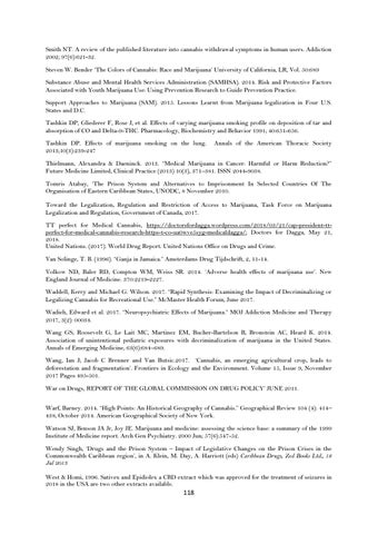 Thielmann, Alexandra & Daeninck. 2013. “Medical Marijuana in Cancer: Harmful or Harm Reduction?” Future Medicine Limited, Clinical Practice (2013) 10(3), 371–381. ISSN 2044-9038. Tomris Atabay, ‘The Prison System and Alternatives to Imprisonment In Selected Countries Of The Organisation of Eastern Caribbean States, UNODC, 8 November 2010. Toward the Legalization, Regulation and Restriction of Access to Marijuana, Task Force on Marijuana Legalization and Regulation, Government of Canada, 2017. TT perfect for Medical Cannabis, https://doctorsfordagga.wordpress.com/2018/03/21/cap-president-ttperfect-for-medical-cannabis-research-https-t-co-ua0wve5syg-medicaldagga/; Doctors for Dagga, May 21, 2018. United Nations. (2017). World Drug Report. United Nations Office on Drugs and Crime. Van Solinge, T. B. (1996). “Ganja in Jamaica.” Amsterdams Drug Tijdschrift, 2, 11-14. Volkow ND, Baler RD, Compton WM, Weiss SR. 2014. ‘Adverse health effects of marijuana use’. New England Journal of Medicine. 370:2219-2227. Waddell, Kerry and Michael G. Wilson. 2017. “Rapid Synthesis: Examining the Impact of Decriminalizing or Legalizing Cannabis for Recreational Use.” McMaster Health Forum, June 2017. Wadieh, Edward et al. 2017. “Neuropsychiatric Effects of Marijuana.” MOJ Addiction Medicine and Therapy 2017, 3(2): 00034. Wang GS, Roosevelt G, Le Lait MC, Martinez EM, Bucher-Bartelson B, Bronstein AC, Heard K. 2014. Association of unintentional pediatric exposures with decriminalization of marijuana in the United States. Annals of Emerging Medicine, 63(6):684–689. Wang, Ian J; Jacob C Brenner and Van Butsic.2017. ‘Cannabis, an emerging agricultural crop, leads to deforestation and fragmentation’. Frontiers in Ecology and the Environment. Volume 15, Issue 9, November 2017 Pages 495-501. War on Drugs, REPORT OF THE GLOBAL COMMISSION ON DRUG POLICY’ JUNE 2011. Warf, Barney. 2014. “High Points: An Historical Geography of Cannabis.” Geographical Review 104 (4): 414– 438, October 2014. American Geographical Society of New York. Watson SJ, Benson JA Jr, Joy JE. Marijuana and medicine: assessing the science base: a summary of the 1999 Institute of Medicine report. Arch Gen Psychiatry. 2000 Jun; 57(6):547-52. Wendy Singh, ‘Drugs and the Prison System – Impact of Legislative Changes on the Prison Crises in the Commonwealth Caribbean region’, in A. Klein, M. Day, A. Harriott (eds) Caribbean Drugs, Zed Books Ltd., 18 Jul 2013 West & Homi, 1996. Sativex and Epidiolex a CBD extract which was approved for the treatment of seizures in 2018 in the USA are two other extracts available.