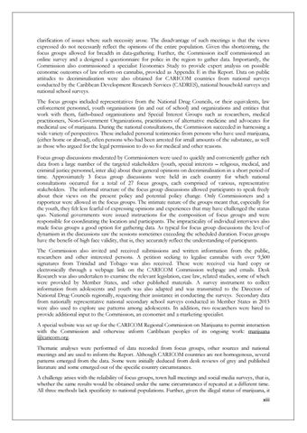 clarification of issues where such necessity arose. The disadvantage of such meetings is that the views expressed do not necessarily reflect the opinions of the entire population. Given this shortcoming, the focus groups allowed for breadth in data-gathering. Further, the Commission itself commissioned an online survey and a designed a questionnaire for police in the region to gather data. Importantly, the Commission also commissioned a specialist Economics Study to provide expert analysis on possible economic outcomes of law reform on cannabis, provided as Appendix E in this Report. Data on public attitudes to decriminalisation were also obtained for CARICOM countries from national surveys conducted by the Caribbean Development Research Services (CADRES), national household surveys and national school surveys. The focus groups included representatives from the National Drug Councils, or their equivalents, law enforcement personnel, youth organisations (in and out of school) and organizations and entities that work with them, faith–based organisations and Special Interest Groups such as researchers, medical practitioners, Non-Government Organizations, practitioners of alternative medicine and advocates for medicinal use of marijuana. During the national consultations, the Commission succeeded in harnessing a wide variety of perspectives. These included personal testimonies from persons who have used marijuana, (either home or abroad), often persons who had been arrested for small amounts of the substance, as well as those who argued for the legal permission to do so for medical and other reasons. Focus group discussions moderated by Commissioners were used to quickly and conveniently gather rich data from a large number of the targeted stakeholders (youth, special interests – religious, medical, and criminal justice personnel, inter alia) about their general opinions on decriminalisation in a short period of time. Approximately 3 focus group discussions were held in each country for which national consultations occurred for a total of 27 focus groups, each comprised of various, representative stakeholders. The informal structure of the focus group discussions allowed participants to speak freely about their views on the present policy and potential policy change. Only Commissioners and a rapporteur were allowed in the focus groups. The intimate nature of the groups meant that, especially for the youth, they felt less fearful of expressing opinions and experiences that may have challenged the status quo. National governments were issued instructions for the composition of focus groups and were responsible for coordinating the location and participants. The impracticality of individual interviews also made focus groups a good option for gathering data. As typical for focus group discussions the level of dynamism in the discussions saw the sessions sometimes exceeding the scheduled duration. Focus groups have the benefit of high face validity, that is, they accurately reflect the understanding of participants. The Commission also invited and received submissions and written information from the public, researchers and other interested persons. A petition seeking to legalise cannabis with over 9,500 signatures from Trinidad and Tobago was also received. These were received via hard copy or electronically through a webpage link on the CARICOM Commission webpage and emails. Desk Research was also undertaken to examine the relevant legislation, case law, related studies, some of which were provided by Member States, and other published materials. A survey instrument to collect information from adolescents and youth was also adapted and was transmitted to the Directors of National Drug Councils regionally, requesting their assistance in conducting the surveys. Secondary data from nationally representative national secondary school surveys conducted in Member States in 2013 were also used to explore use patterns among adolescents. In addition, two researchers were hired to provide additional input to the Commission, an economist and a marketing specialist. A special website was set up for the CARICOM Regional Commission on Marijuana to permit interaction with the Commission and otherwise inform Caribbean peoples of its ongoing work: marijuana @caricom.org. Thematic analyses were performed of data recorded from focus groups, other sources and national meetings and are used to inform the Report. Although CARICOM countries are not homogenous, several patterns emerged from the data. Some were initially deduced from desk reviews of grey and published literature and some emerged out of the specific country circumstances. A challenge arises with the reliability of focus groups, town hall meetings and social media surveys, that is, whether the same results would be obtained under the same circumstances if repeated at a different time. All three methods lack specificity to national populations. Further, given the illegal status of marijuana, it xiii