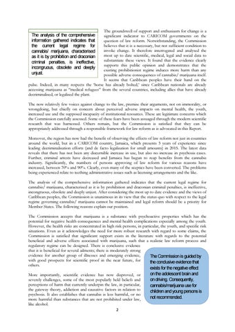 The now relatively few voices against change to the law, premise their arguments, not on immorality, or wrongdoing, but chiefly on concern about perceived adverse impacts on mental health, the youth, increased use and the supposed incapacity of institutional resources. These are legitimate concerns which the Commission carefully assessed. Some of these fears have been assuaged through the modern scientific research that was harnessed. Others remain, but the Commission is satisfied that they can be appropriately addressed through a responsible framework for law reform as is advocated in this Report. Moreover, the region has now had the benefit of observing the effects of law reform not just in countries around the world, but in a CARICOM country, Jamaica, which presents 3 years of experience since leading decriminalisation efforts (and de facto legalisation for small amounts) in 2015. The latest data reveals that there has not been any discernible increase in use, but also no increase in psychosis cases. Further, criminal arrests have decreased and Jamaica has begun to reap benefits from the cannabis industry. Significantly, the numbers of persons approving of law reform for various reasons have increased, between 70% and 90%. Clearly, even many of the sceptics have been converted. The problems being experienced relate to teething administrative issues such as licensing arrangements and the like. The analysis of the comprehensive information gathered indicates that the current legal regime for cannabis/ marijuana, characterised as it is by prohibition and draconian criminal penalties, is ineffective, incongruous, obsolete and deeply unjust. After considering the most up to date evidence and the views of Caribbean peoples, the Commission is unanimous in its view that the status quo with respect to the legal regime governing cannabis/ marijuana cannot be maintained and legal reform should be a priority for Member States. The following reasons explain our position. The Commission accepts that marijuana is a substance with psychoactive properties which has the potential for negative health consequences and mental health complications especially among the youth. However, the health risks are concentrated in high risk persons, in particular, the youth, and specific risk situations. Even as it acknowledges the need for more robust research with regard to some claims, the Commission is satisfied that significant support exists in the literature with regards to the potential beneficial and adverse effects associated with marijuana, such that a realistic law reform process and regulatory regime can be designed. There is conclusive evidence that it is beneficial for several ailments; there is moderately strong evidence for another group of illnesses and emerging evidence, The Commission is guided by with good prospects for scientific proof in the near future, for the conclusive evidence that others. More importantly, scientific evidence has now disproved, or severely challenges, some of the most popularly held beliefs and perceptions of harm that currently underpin the law, in particular, the gateway theory, addiction and causative factors in relation to psychosis. It also establishes that cannabis is less harmful, or no more harmful than substances that are not prohibited under law, like alcohol. 2