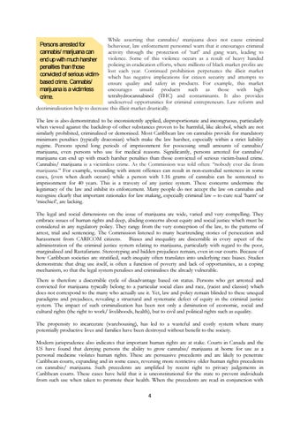 The law is also demonstrated to be inconsistently applied, disproportionate and incongruous, particularly when viewed against the backdrop of other substances proven to be harmful, like alcohol, which are not similarly prohibited, criminalised or demonised. Most Caribbean law on cannabis provide for mandatory minimum penalties (typically draconian) which make the law harsher, especially within a strict liability regime. Persons spend long periods of imprisonment for possessing small amounts of cannabis/ marijuana, even persons who use for medical reasons. Significantly, persons arrested for cannabis/ marijuana can end up with much harsher penalties than those convicted of serious victim-based crime. Cannabis/ marijuana is a victimless crime. As the Commission was told often: “nobody ever die from marijuana.” For example, wounding with intent offences can result in non-custodial sentences in some cases, (even when death occurs) while a person with 1.16 grams of cannabis can be sentenced to imprisonment for 40 years. This is a travesty of any justice system. These concerns undermine the legitimacy of the law and inhibit its enforcement. Many people do not accept the law on cannabis and recognise clearly that important rationales for law making, especially criminal law – to cure real ‘harm’ or ‘mischief’, are lacking. The legal and social dimensions on the issue of marijuana are wide, varied and very compelling. They embrace issues of human rights and deep, abiding concerns about equity and social justice which must be considered in any regulatory policy. They range from the very conception of the law, to the patterns of arrest, trial and sentencing. The Commission listened to many heartrending stories of persecution and harassment from CARICOM citizens. Biases and inequality are discernible in every aspect of the administration of the criminal justice system relating to marijuana, particularly with regard to the poor, marginalised and Rastafarians. Stereotyping and hidden prejudices remain, even in our courts. Because of how Caribbean societies are stratified, such inequity often translates into underlying race biases. Studies demonstrate that drug use itself, is often a function of poverty and lack of opportunities, as a coping mechanism, so that the legal system penalises and criminalises the already vulnerable. There is therefore a discernible cycle of disadvantage based on status. Persons who get arrested and convicted for marijuana typically belong to a particular social class and race, (racist and classist) which does not correspond to the many who actually use it. Yet, law and policy remain blinded to these unequal paradigms and prejudices, revealing a structural and systematic defect of equity in the criminal justice system. The impact of such criminalisation has been not only a diminution of economic, social and cultural rights (the right to work/ livelihoods, health), but to civil and political rights such as equality. The propensity to incarcerate (warehousing), has led to a wasteful and costly system where many potentially productive lives and families have been destroyed without benefit to the society. Modern jurisprudence also indicates that important human rights are at stake. Courts in Canada and the US have found that denying persons the ability to grow cannabis/ marijuana at home for use as a personal medicine violates human rights. These are persuasive precedents and are likely to penetrate Caribbean courts, expanding and in some cases, reversing more restrictive older human rights precedents on cannabis/ marijuana. Such precedents are amplified by recent right to privacy judgements in Caribbean courts. These cases have held that it is unconstitutional for the state to prevent individuals from such use when taken to promote their health. When the precedents are read in conjunction with 4