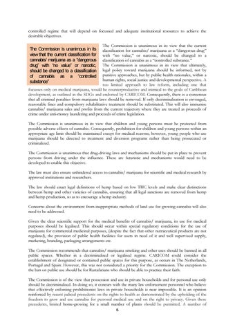 controlled regime that will depend on focussed and adequate institutional resources to achieve the desirable objectives. The Commission is unanimous in its view that the current classification for cannabis/ marijuana as a “dangerous drug” with “no value,” or narcotic, should be changed to a classification of cannabis as a “controlled substance.” The Commission is unanimous in its view that ultimately, legal policy toward marijuana should be informed, not by punitive approaches, but by public health rationales, within a human rights, social justice and developmental perspective. A too limited approach to law reform, including one that focusses only on medical marijuana, would be counterproductive and inimical to the goals of Caribbean development, as outlined in the SDGs and endorsed by CARICOM. Consequently, there is a consensus that all criminal penalties from marijuana laws should be removed. If only decriminalisation is envisaged, reasonable fines and compulsory rehabilitative treatment should be substituted. This will also immunise cannabis/ marijuana sales and profits from the current trajectory where they are treated as proceeds of crime under anti-money laundering and proceeds of crime legislation.