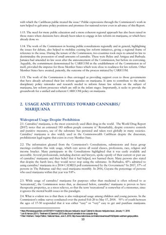 with which the Caribbean public treated the issue.6 Public expressions through the Commission’s work in turn helped to galvanise policy positions and promises for national review even in advance of this Report. 1.13. The need for more public education and a more coherent regional approach has also been raised in those states where decisions have already been taken to engage in law reform on marijuana, or which have already done so. 1.14. The work of the Commission in hosting public consultations regionally and in general, highlighting the issues for debate, also helped to mobilise existing law reform initiatives, giving a regional frame of reference to the issue. During the tenure of the Commission, two countries took steps to amend its law to decriminalise the possession of small amounts of cannabis. These were Belize and Antigua and Barbuda. Jamaica had amended its law soon after the announcement of the Commission, but before its convening. Arguably, the commitment demonstrated by CARICOM in the establishment of the Commission in of itself, provided the impetus for those Member States which were close to readiness for law reform. Other Member States have awaited, patiently, the outcome of the process initiated by CARICOM. 1.15. The work of the Commission is thus envisaged as providing support even to those governments that have already advanced their law reform agendas on marijuana. It aims to contribute to the multidisciplinary policy rationales and research needed to inform future law reform on the subject of marijuana, law reform processes which are still in the infant stages. Importantly, it seeks to provide the groundwork for a unified and coherent CARICOM policy on marijuana.