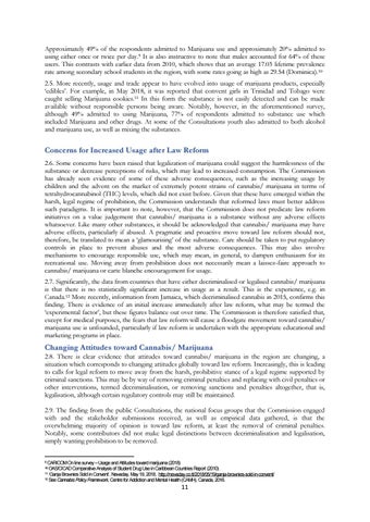 Concerns for Increased Usage after Law Reform 2.6. Some concerns have been raised that legalization of marijuana could suggest the harmlessness of the substance or decrease perceptions of risks, which may lead to increased consumption. The Commission has already seen evidence of some of these adverse consequences, such as the increasing usage by children and the advent on the market of extremely potent strains of cannabis/ marijuana in terms of tetrahydrocannabinol (THC) levels, which did not exist before. Given that these have emerged within the harsh, legal regime of prohibition, the Commission understands that reformed laws must better address such paradigms. It is important to note, however, that the Commission does not predicate law reform initiatives on a value judgement that cannabis/ marijuana is a substance without any adverse effects whatsoever. Like many other substances, it should be acknowledged that cannabis/ marijuana may have adverse effects, particularly if abused. A pragmatic and proactive move toward law reform should not, therefore, be translated to mean a ‘glamourising’ of the substance. Care should be taken to put regulatory controls in place to prevent abuses and the most adverse consequences. This may also involve mechanisms to encourage responsible use, which may mean, in general, to dampen enthusiasm for its recreational use. Moving away from prohibition does not necessarily mean a laissez-faire approach to cannabis/ marijuana or carte blanche encouragement for usage. 2.7. Significantly, the data from countries that have either decriminalised or legalised cannabis/ marijuana is that there is no statistically significant increase in usage as a result. This is the experience, e.g. in Canada.12 More recently, information from Jamaica, which decriminalised cannabis in 2015, confirms this finding. There is evidence of an initial increase immediately after law reform, what may be termed the ‘experimental factor’, but these figures balance out over time. The Commission is therefore satisfied that, except for medical purposes, the fears that law reform will cause a floodgate movement toward cannabis/ marijuana use is unfounded, particularly if law reform is undertaken with the appropriate educational and marketing programs in place.