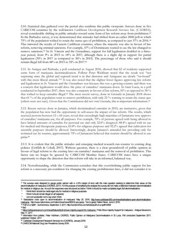2.10. Statistical data gathered over the period also confirms this public viewpoint. Surveys done in five CARICOM countries by the well-known Caribbean Development Research Services Inc. (CADRES), reveal considerable shifting in public attitudes toward some form of law reform away from prohibition. 13 In the Barbados survey, it was demonstrated that attitudes had shifted from an earlier 2008 poll in which 73% of the population wished to retain the status quo of prohibition, as compared to just 37% in 2016. 14 This mirrored the results of Eastern Caribbean countries, where the majority was also in favour of law reform, removing criminal sanctions. For example, 57% of Dominicans wanted to see the law changed to remove sanctions.15 In St. Vincent and the Grenadines, support for full legalisation doubled in a threeyear period, from 9% in 2013 to 18% in 2017, although there is a slight dip in support for partial legalisation (35% in 2017 as compared to 36% in 2013). The percentage of those who said it should remain illegal fell from 44% in 2013 to 35% in 2017.16 2.11. In Antigua and Barbuda, a poll conducted in August 2016, showed that 62 of residents supported some form of marijuana decriminalization. Pollster Peter Wickham noted that the result was “not surprising since the global and regional trend is in that direction and Antiguans are clearly “on-board” with this more liberal attitude.”17 It was also noted that the slighter lower figures approving law reform and legalization in St. Vincent and the Grenadines was because this was a growing country and there was a concern that legalization would drive the price of cannabis/ marijuana down. In Saint Lucia, in a poll conducted in September 2017, there was also a majority in favour of law reform, 51% as opposed to 38 % that wished to keep cannabis illegal.18 The most recent survey, done in Grenada in January 2018 shows that 61 % of the population want to remove prohibition, with only 22 % wanting to retain the status quo (others were not sure). Given that the Commission did not visit Grenada, this is important information.19 2.12. Recent surveys done in Jamaica, which decriminalized cannabis in 2015, are instructive, given that the population has now had the opportunity to self-assess the impact of law reform. The results, which assessed persons between 12 – 65 years, reveal that exceedingly high majorities of Jamaicans now approve of cannabis/ marijuana use, for all purposes. For example, 70% of persons agreed with being allowed to have limited amounts of cannabis for personal use and only 22.6% disagreed. 88.4% agreed with its use for medical and therapeutic purposes; 63.8% for religious purposes and 92.2% agreed that cultivation for scientific purposes should be allowed. Interestingly, despite Jamaica’s amended law providing only for restricted use by tourists, approximately 75% of Jamaicans believed that tourists should be allowed to use ganja.20 2.1.3. It is evident that the public attitudes and emerging medical research run counter to existing drug policies (Griffith & Cohall, 2017). Without question, there is a clear groundswell of public opinion in favour of legal reform to the existing laws on cannabis/ marijuana and the removal of prohibition. This factor can no longer be ignored by CARICOM Member States. CARICOM states have a unique opportunity to shape the direction that this reform will take in an informed, balanced way. 2.14. Notwithstanding, while the Commission considers that this overwhelming public support for law reform is a necessary pre-condition for changing the existing prohibitionist laws, it did not consider it to