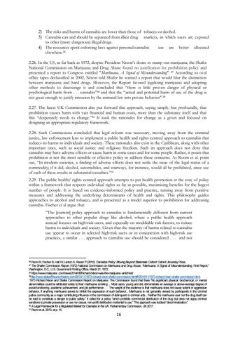 2.26. In the US, as far back as 1972, despite President Nixon’s desire to stamp out marijuana, the Shafer National Commission on Marijuana and Drug Abuse found no justification for prohibition policy and presented a report to Congress entitled "Marihuana, A Signal of Misunderstanding". 27 According to oval office tapes declassified in 2002, Nixon told Shafer he wanted a report that would blur the distinction between marijuana and hard drugs. However, the Report favored legalizing marijuana and adopting other methods to discourage it and concluded that “there is little proven danger of physical or psychological harm from . . . cannabis"28 and that the “actual and potential harm of use of the drug is not great enough to justify intrusion by the criminal law into private behavior".29 2.27. The latest UK Commission also put forward this approach, saying simply, but profoundly, that prohibition causes harm with vast financial and human costs, more than the substance itself and that this “desperately needs to change.”30 It took the rationales for change as a given and focused on designing an appropriate regulatory framework. 2.28. Such Commissions concluded that legal reform was necessary, moving away from the criminal justice, law enforcement lens to implement a public health and rights centred approach to cannabis that reduces its harms to individuals and society. These rationales also exist in the Caribbean, along with other important ones, such as social justice and religious freedom. Such an approach does not deny that cannabis may have adverse effects or cause harm in some cases and for some people. Rather, it posits that prohibition is not the most sensible or effective policy to address those concerns. As Room et al. point out, “In modern societies, a finding of adverse effects does not settle the issue of the legal status of a commodity; if it did, alcohol, automobiles, and stairways, for instance, would all be prohibited, since use of each of these results in substantial casualties.”31 2.29. The public health/ rights centred approach attempts to put health promotion at the core of policy within a framework that respects individual rights as far as possible, maximising benefits for the largest number of people. It is based on evidence‐informed policy and practice, turning away from punitive measures and addressing the underlying determinants of health and rights. This philosophy guides approaches to alcohol and tobacco, and is presented as a model superior to prohibition for addressing cannabis. Fischer et al argue that: “The [current] policy approach to cannabis is fundamentally different from current approaches to other popular drugs like alcohol, where a public health approach instead focuses on high‐risk users, and especially on modifiable risk factors, to reduce harms to individuals and society. Given that the majority of harms related to cannabis use appear to occur in selected high‐risk users or in conjunction with high‐risk use practices, a similar . . . approach to cannabis use should be considered . . . and not