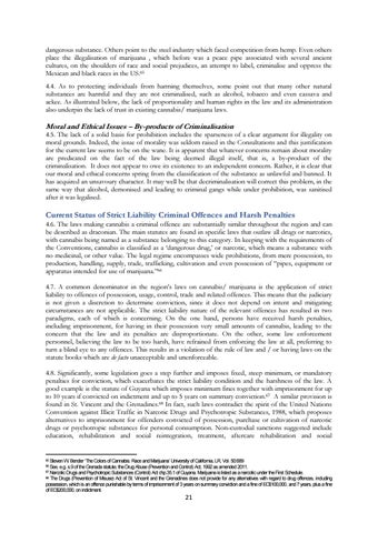 4.6. The laws making cannabis a criminal offence are substantially similar throughout the region and can be described as draconian. The main statutes are found in specific laws that outlaw all drugs or narcotics, with cannabis being named as a substance belonging to this category. In keeping with the requirements of the Conventions, cannabis is classified as a ‘dangerous drug,’ or narcotic, which means a substance with no medicinal, or other value. The legal regime encompasses wide prohibitions, from mere possession, to production, handling, supply, trade, trafficking, cultivation and even possession of “pipes, equipment or apparatus intended for use of marijuana.”66 4.7. A common denominator in the region’s laws on cannabis/ marijuana is the application of strict liability to offences of possession, usage, control, trade and related offences. This means that the judiciary is not given a discretion to determine conviction, since it does not depend on intent and mitigating circumstances are not applicable. The strict liability nature of the relevant offences has resulted in two paradigms, each of which is concerning. On the one hand, persons have received harsh penalties, including imprisonment, for having in their possession very small amounts of cannabis, leading to the concern that the law and its penalties are disproportionate. On the other, some law enforcement personnel, believing the law to be too harsh, have refrained from enforcing the law at all, preferring to turn a blind eye to any offences. This results in a violation of the rule of law and / or having laws on the statute books which are de facto unacceptable and unenforceable. 4.8. Significantly, some legislation goes a step further and imposes fixed, steep minimum, or mandatory penalties for conviction, which exacerbates the strict liability condition and the harshness of the law. A good example is the statute of Guyana which imposes minimum fines together with imprisonment for up to 10 years if convicted on indictment and up to 5 years on summary conviction.67 A similar provision is found in St. Vincent and the Grenadines.68 In fact, such laws contradict the spirit of the United Nations Convention against Illicit Traffic in Narcotic Drugs and Psychotropic Substances, 1988, which proposes alternatives to imprisonment for offenders convicted of possession, purchase or cultivation of narcotic drugs or psychotropic substances for personal consumption. Non-custodial sanctions suggested include education, rehabilitation and social reintegration, treatment, aftercare rehabilitation and social