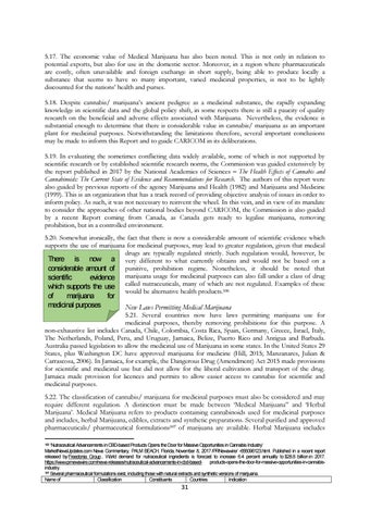 5.17. The economic value of Medical Marijuana has also been noted. This is not only in relation to potential exports, but also for use in the domestic sector. Moreover, in a region where pharmaceuticals are costly, often unavailable and foreign exchange in short supply, being able to produce locally a substance that seems to have so many important, varied medicinal properties, is not to be lightly discounted for the nations’ health and purses. 5.18. Despite cannabis/ marijuana’s ancient pedigree as a medicinal substance, the rapidly expanding knowledge in scientific data and the global policy shift, in some respects there is still a paucity of quality research on the beneficial and adverse effects associated with Marijuana. Nevertheless, the evidence is substantial enough to determine that there is considerable value in cannabis/ marijuana as an important plant for medicinal purposes. Notwithstanding the limitations therefore, several important conclusions may be made to inform this Report and to guide CARICOM in its deliberations. 5.19. In evaluating the sometimes conflicting data widely available, some of which is not supported by scientific research or by established scientific research norms, the Commission was guided extensively by the report published in 2017 by the National Academies of Sciences – The Health Effects of Cannabis and Cannabinoids: The Current State of Evidence and Recommendations for Research. The authors of this report were also guided by previous reports of the agency Marijuana and Health (1982) and Marijuana and Medicine (1999). This is an organization that has a track record of providing objective analysis of issues in order to inform policy. As such, it was not necessary to reinvent the wheel. In this vein, and in view of its mandate to consider the approaches of other national bodies beyond CARICOM, the Commission is also guided by a recent Report coming from Canada, as Canada gets ready to legalise marijuana, removing prohibition, but in a controlled environment. 5.20. Somewhat ironically, the fact that there is now a considerable amount of scientific evidence which supports the use of marijuana for medicinal purposes, may lead to greater regulation, given that medical drugs are typically regulated strictly. Such regulation would, however, be There is now a very different to what currently obtains and would not be based on a considerable amount of punitive, prohibition regime. Nonetheless, it should be noted that scientific evidence marijuana usage for medicinal purposes can also fall under a class of drug which supports the use called nutraceuticals, many of which106are not regulated. Examples of these would be alternative health products.