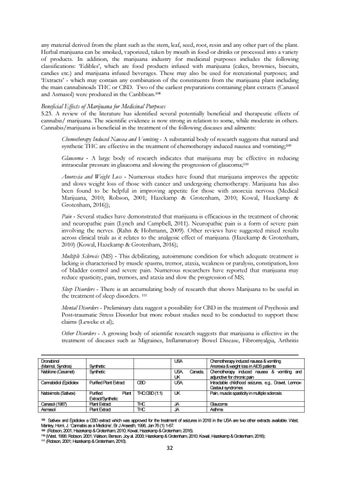 5.23. A review of the literature has identified several potentially beneficial and therapeutic effects of cannabis/ marijuana. The scientific evidence is now strong in relation to some, while moderate in others. Cannabis/marijuana is beneficial in the treatment of the following diseases and ailments: Chemotherapy Induced Nausea and Vomiting - A substantial body of research suggests that natural and synthetic THC are effective in the treatment of chemotherapy induced nausea and vomiting;109 Glaucoma - A large body of research indicates that marijuana may be effective in reducing intraocular pressure in glaucoma and slowing the progression of glaucoma;110 Anorexia and Weight Loss - Numerous studies have found that marijuana improves the appetite and slows weight loss of those with cancer and undergoing chemotherapy. Marijuana has also been found to be helpful in improving appetite for those with anorexia nervosa (Medical Marijuana, 2010; Robson, 2001; Hazekamp & Grotenham, 2010; Kowal, Hazekamp & Grotenham, 2016)); Pain - Several studies have demonstrated that marijuana is efficacious in the treatment of chronic and neuropathic pain (Lynch and Campbell, 2011). Neuropathic pain is a form of severe pain involving the nerves. (Rahn & Hohmann, 2009). Other reviews have suggested mixed results across clinical trials as it relates to the analgesic effect of marijuana. (Hazekamp & Grotenham, 2010) (Kowal, Hazekamp & Grotenham, 2016); Multiple Sclerosis (MS) - This debilitating, autoimmune condition for which adequate treatment is lacking is characterised by muscle spasms, tremor, ataxia, weakness or paralysis, constipation, loss of bladder control and severe pain. Numerous researchers have reported that marijuana may reduce spasticity, pain, tremors, and ataxia and slow the progression of MS; Sleep Disorders - There is an accumulating body of research that shows Marijuana to be useful in the treatment of sleep disorders. 111 Mental Disorders - Preliminary data suggest a possibility for CBD in the treatment of Psychosis and Post-traumatic Stress Disorder but more robust studies need to be conducted to support these claims (Leweke et al); Other Disorders - A growing body of scientific research suggests that marijuana is effective in the treatment of diseases such as Migraines, Inflammatory Bowel Disease, Fibromyalgia, Arthritis Dronabinol (Marinol, Syndros) Nabilone (Cesamet)