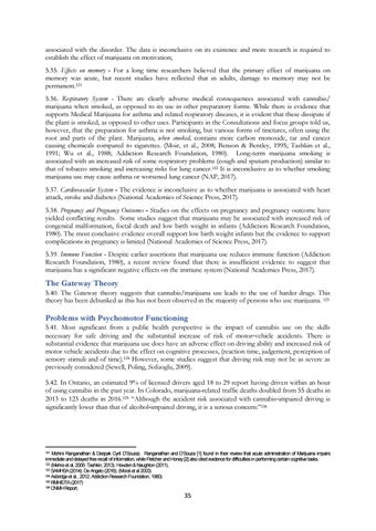 Mohini Ranganathan & Deepak Cyril D’Souza). Ranganathan and D’Souza [1] found in their review that acute administration of Marijuana impairs immediate and delayed free recall of information, while Fletcher and Honey [2] also cited evidence for difficulties in performing certain cognitive tasks. 122 (Mehra et al, 2006; Tashkin, 2013). Howden & Naughton (2011). 123 SAMHSA (2014); De Angelo (2016); (Moral et al 2003). 124 Asbridge et al., 2012; Addiction Research Foundation, 1980). 125 RMHIDTA (2017) 126 CNMH Report, 121