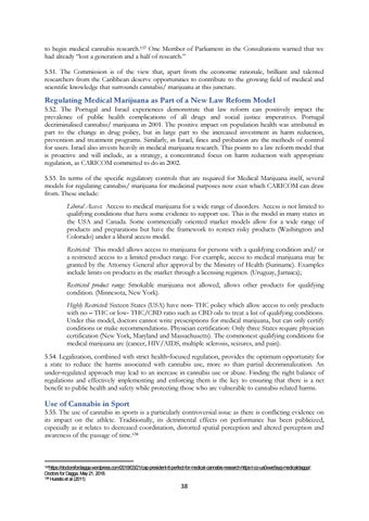 5.52. The Portugal and Israel experiences demonstrate that law reform can positively impact the prevalence of public health complications of all drugs and social justice imperatives. Portugal decriminalised cannabis/ marijuana in 2001. The positive impact on population health was attributed in part to the change in drug policy, but in large part to the increased investment in harm reduction, prevention and treatment programs. Similarly, in Israel, fines and probation are the methods of control for users. Israel also invests heavily in medical marijuana research. This points to a law reform model that is proactive and will include, as a strategy, a concentrated focus on harm reduction with appropriate regulation, as CARICOM committed to do in 2002. 5.53. In terms of the specific regulatory controls that are required for Medical Marijuana itself, several models for regulating cannabis/ marijuana for medicinal purposes now exist which CARICOM can draw from. These include: Liberal Access: Access to medical marijuana for a wide range of disorders. Access is not limited to qualifying conditions that have some evidence to support use. This is the model in many states in the USA and Canada. Some commercially oriented market models allow for a wide range of products and preparations but have the framework to restrict risky products (Washington and Colorado) under a liberal access model. Restricted: This model allows access to marijuana for persons with a qualifying condition and/ or a restricted access to a limited product range. For example, access to medical marijuana may be granted by the Attorney General after approval by the Ministry of Health (Suriname). Examples include limits on products in the market through a licensing regimen. (Uruguay, Jamaica); Restricted product range: Smokable marijuana not allowed, allows other products for qualifying condition. (Minnesota, New York). Highly Restricted: Sixteen States (USA) have non- THC policy which allow access to only products with no – THC or low- THC/CBD ratio such as CBD oils to treat a list of qualifying conditions. Under this model, doctors cannot write prescriptions for medical marijuana, but can only certify conditions or make recommendations. Physician certification: Only three States require physician certification (New York, Maryland and Massachusetts). The commonest qualifying conditions for medical marijuana are (cancer, HIV/AIDS, multiple sclerosis, seizures, and pain). 5.54. Legalization, combined with strict health‐focused regulation, provides the optimum opportunity for a state to reduce the harms associated with cannabis use, more so than partial decriminalization. An under‐regulated approach may lead to an increase in cannabis use or abuse. Finding the right balance of regulations and effectively implementing and enforcing them is the key to ensuring that there is a net benefit to public health and safety while protecting those who are vulnerable to cannabis related harms.