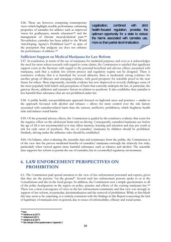 6. LAW ENFORCEMENT PERSPECTIVES ON PROHIBITION 6.1. The Commission paid special attention to the view of law enforcement personnel and experts, given that they are the persons “on the ground’’. Several such law enforcement persons spoke to us at the Consultations and also in the focal groups. In addition, the Commission sent a simple questionnaire to all of the police headquarters in the region on policy, practice and effects of the existing marijuana law.143 There was a clear convergence of views in the law enforcement community and that view was strongly in support of law reform, in particular, decriminalisation and the removal of prohibition. While at first blush this may seem to be surprising, it is entirely consistent with the findings in this Report concerning the lack of legitimacy of marijuana laws in general, due to issues of enforceability, efficacy and social justice.