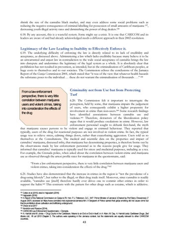 6.19. The underlying difficulty of enforcing the law is directly related to its lack of credibility and acceptance, as discussed above. Administering a law which lacks credibility because many believe it to be an unwarranted and unjust law in contradiction to the wide social acceptance of cannabis brings the law into disrepute and undermines the legitimacy of the legal system as a whole. It is absolutely clear that prohibition has not resulted in prevention, as intended, but in the criminalisation of Caribbean peoples, at huge costs to themselves and to our societies. The Commission echoes the conclusions of the Jamaica Report of the Ganja Commission 2001, which stated that “it was of the view that whatever health hazards the substance poses to the individual … these do not warrant the criminalisation of thousands . . .” 159
