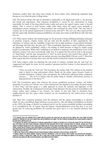 Numerous studies show that drug users commit far fewer crimes when undergoing outpatient drug therapy or even when the price of drugs drops. 6.22. The related violence that may be identified is attributable to the illegal trade itself, i.e. the growing, sale (local) and importation. That marijuana prohibition is viewed by law enforcement as being responsible for much of the drug related crimes within and across the region’s nation states is beyond dispute. This is viewed as such because, unlike other drugs where the region serves primarily as transhipment points, marijuana is a drug produced and consumed by many locals. This may lead to violence due to the special requirements to protect crops and turf164. The view was often expressed that had the region fully abolished marijuana prohibition our crime rates today would likely be half what they now are. 6.23. Police reports indicate that criminal gangs use the proceeds of drug trafficking (including marijuana) to purchase weapons, vehicles, homes and pay rank and file members of their organisations. The subculture of violence and the availability of guns have led to high incidences of gun-related homicides and shootings and raids drive the price up.165 This is particularly important as many Caribbean countries are plagued by “micro trafficking”, which is the dealing of small amounts of drugs by mainly young people in communities. While micro trafficking is not limited to marijuana, the proliferation of use of the substance renders it the most economically viable item. It is argued that this activity leads to the creation of “drug blocks” and the clear demarcation of “turf” by those persons who control these blocks. The income from blocks is significant and can include amounts exceeding $5000 USD per week.166 Therefore there is great incentive to protect these areas and this results in increased violence in communities. 6.24. Some analysts, while not disputing the end result of violence, maintain that the ‘turf wars’ are exaggerated and largely for crack, not for cannabis/ marijuana and that violence is often initiated by law enforcement: “There are rarely the “turf wars” that accompany the cocaine trade. The violence in the cannabis trade is linked to drug enforcement efforts. Rarely do the police report firearms found on cannabis plantations. Violence often accompanies the well-armed, militarised police eradication exercises . . . The level of violence that the police bring to cannabis enforcement exercises is disproportionate to the threat.”167 6.25. The Commission agrees that whatever the reason, prohibition promotes violence and further criminality. It concurs too with the views of law enforcement that legislation that tackles the purse-strings of these ‘dons’ and their gangs is a viable approach to return the authority and legitimacy of law enforcement. Notably, the Commission’s Economics Study illustrates that the removal of prohibition will reduce market price, making it less lucrative for cartels. It may also help to transform these neighbourhoods into free spaces where residents are not encumbered by the violent power of gang members.168 6.26. Many have compared marijuana, both the substance and the regime surrounding it, to alcohol, which was also a prohibited, illegal substance in years gone by. After the lifting of prohibition on alcohol in the 1930’s, the image of alcohol was sanitised and so was the serious criminality problem surrounding it, as exemplified by the Al Capone drug don legend. Anti-prohibitionists assert that there is an even greater case for removing prohibition for cannabis laws given that it is a less harmful substance than alcohol.