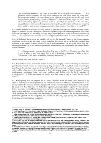( Baer, H., Singer, M., and Susser, I. Medical Anthropology and the World System. Westport, CT: Praeger Publishers, 2003, 131 -). Wendy Singh, ‘Drugs and the Prison System – Impact of Legislative Changes on the Prison Crises in the Commonwealth Caribbean region’, in A. Klein, M. Day, A. Harriott (eds) Caribbean Drugs, Zed Books Ltd., 18 Jul 2013, Chapter 4. 172 Husak, Douglas. Legalize This! The case for decriminalizing drugs. New York, NY: Verso, 2002.: 135). Estimates from the Bureau of Justice Statistics show that young black men are more likely to go to prison than to attend college. 173 Wortley S, Owusu‐Bempah A (2012). Race, ethnicity, crime and criminal justice in Canada. In Kalunta‐ Crumpton (ed.), Race, Ethnicity, Crime and Criminal Justice in the Americas. New York: Palgrave Macmillan. 174 (Husak 2002: 136) There are, however, strides being made to rectify the racial bias at work in the legal system. Recently, a Supreme Court ruling overturned a U.S. appeals court ruling that judges could not hand down lesser punishments on the basis that they disagreed with the wide disparities for crack and powder cocaine sentences. Nevertheless, these laws remain in place, contributing to the inequalities in drug use and the criminal justice system.” 175 Scherf (2015). Persons of African descent, and to a lesser degree persons of Latin American descent, from disadvantaged communities are more likely to be arrested, prosecuted and imprisoned for marijuana possession offences. Golub et al (2007); Evans (2013); Caulkins et al (2014) and Scherf (2015) 176Inequality and Drug Use’, Mary Kate McNamara, Emily Schirack, Dana Sherry & Amy Vereecke https://neuroanthropology.net/2008/05/06/inequality-anddrug-use/. 170 171