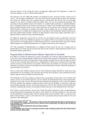8.11. When we examine the imperatives of justice and equality, one of the key rights principles that comes to the fore, is that of proportionality. Public law has embraced this principle as fundamental to fairness in the administration of justice. Proportionality, which mandates the legal system to take the approach which is least invasive of human rights (and not use a sledgehammer to kill an ant), is pertinent to the marijuana question and the overall concerns of inequality, inherent bias and unfairness in the legal system. The treatment of cannabis/ marijuana in the legal system and administration of justice offends the principle of proportionality in several ways. First, it is clear that Caribbean citizens can have their fundamental rights disturbed in much more deep and harmful ways for smoking a ‘joint’ that they can for what most will agree is more harmful and serious offences against society, including assault and the like. 8.12. Secondly, the fact that cannabis/ marijuana users are penalised severely when users of alcohol and tobacco, proven to be harmful substances, are not, offends the fundamental fairness and proportionality objectives of the justice system. This inconsistency undermines the legitimacy of the system. In addition, the harsh penalties that cannabis/ marijuana attracts, often with no flexibility or discretion, violate the proportionality principle and core tenets of the legal system. The fact that substances more harmful than cannabis/ marijuana, like cocaine, are scheduled similarly under law, is also disproportionate and unfair. 8.13. Further, as discussed above, the fact that, within drug policy enforcement, there are discriminatory enforcement patterns compromises the fairness of the system. It is felt that, typically, it is the users and not the traffickers or big time dealers that the criminal justice system confronts. This is a concern for all kinds of drug offences – that it is the ‘little man’ who is persecuted and prosecuted, while the ‘fat cats’ remain free and undisturbed. See Johnson v Balwant, for example . . . when saved laws in Trinidad and Tobago which permitted female police officers to be dismissed because of family responsibilities, were complained about by the Court, but it noted that it could do nothing because of the saving law clause and called upon Parliament to change the law. 191 Civil Suit No. 191 of 1996, dec’d September 2001, high Court of Antigua and Barbuda. 192 29 (1999) CILR 307. 193It viewed Rastafarianism more in the nature of a ‘socio-political movement than a religion,’ emphasising an approach which relied on faith and worship of a particular God or deity in defining a religion. 190