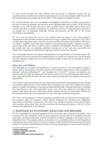 9.11. Marijuana use by children and adolescents, is of grave concern as it has been linked to cognitive deficits, anxiety and depressive disorders, amotivational syndrome, (demotivation which contributes to decreased academic performance)200 and dropping out of school.201 Cannabis consumption may therefore adversely affect the educational outcomes of youth users as it could compromise their ability to derive maximum benefits from the education system and in so doing limit their academic and economic opportunities. 9.12. Teachers, education professionals, and some medical professionals who participated at the National Consultations addressed some of the harmful effects of marijuana on youth. These included the adverse impact on cognitive development, reasoning and critical thinking skills. Principals and Deans of discipline have been known to take varied approaches to this issue, with some opting for counselling for the students while others call in law enforcement officials. Students who face law enforcement officials may find themselves before the court and therefore at risk for the aforementioned consequences. 9.13. There was the perception of many respondents, especially in the focus groups with young people that marijuana arrests for marijuana -related offences hampered the educational and employment opportunities of offenders. Young people told us that often, cannabis/ marijuana arrests and convictions were conducted along ethnic lines and this exacerbated the discriminatory impact of the law on their education, life opportunities and well-being.