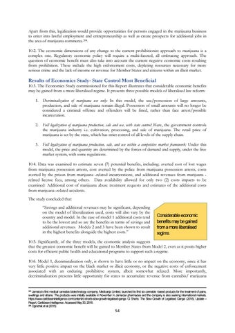 Apart from this, legalization would provide opportunities for persons engaged in the marijuana business to enter into lawful employment and entrepreneurship as well as create prospects for additional jobs in the area of marijuana commerce.204. 10.2. The economic dimensions of any change to the current prohibitionist approach to marijuana is a complex one. Regulatory economic policy will require a multi-faceted, all embracing approach. The question of economic benefit must also take into account the current negative economic costs resulting from prohibition. These include the high enforcement costs, depleting resources necessary for more serious crime and the lack of income or revenue for Member States and citizens within an illicit market.