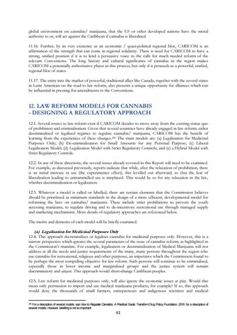 12. LAW REFORM MODELS FOR CANNABIS - DESIGNING A REGULATORY APPROACH 12.1. Several routes to law reform exist if CARICOM decides to move away from the existing status quo of prohibition and criminalisation. Given that several countries have already engaged in law reform, either decriminalised or legalised regimes to regulate cannabis/ marijuana, CARICOM has the benefit of learning from the experiences of these changes.225 The main models are: (a) Legalisation for Medicinal Purposes Only; (b) De-criminalisation for Small Amounts for any Personal Purpose; (c) Liberal Legalisation Model; (d) Legalisation Model with Strict Regulatory Controls; and (e) a Hybrid Model with Strict Regulatory Controls. 12.2. In any of these directions, the several issues already covered in this Report will need to be examined. For example, as discussed previously, reports indicate that while, after the relaxation of prohibition, there is an initial increase in use (the experimenter effect), this levelled out afterward, so that the fear of liberalisation leading to untrammelled use is misplaced. This would be so for any relaxation in the law, whether decriminalisation or legalisation. 12.3. Whatever a model is called or labelled, there are certain elements that the Commission believes should be prioritised as minimum standards in the design of a more efficient, developmental model for reforming the laws on cannabis/ marijuana. These include strict prohibitions to prevent the youth accessing marijuana, to regulate driving and to de-incentivise recreational use through managed supply and marketing mechanisms. More details of regulatory approaches are referenced below. The merits and demerits of each model will be briefly examined.