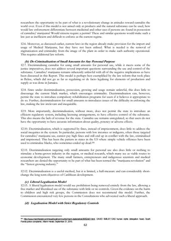 12.13. A liberal legalisation model would see prohibition being removed entirely from the law, allowing a free market and liberalised use of the substance with little or no controls. Given the evidence on the harm to children and high risk groups, the Commission does not recommend this model. Further, the Commission encountered very few persons in the Consultations who advocated such a liberal approach.