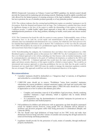 (WHO) Framework Convention on Tobacco Control and WHO guidelines for alcohol control should provide the framework for marketing and advertising controls. Marketing should be tightly controlled and only allowed for the limited purpose of ensuring awareness of the legal availability of cannabis products, but not to promote the use of cannabis products generally or of any particular product. 12.30. The evidence indicates that the existing legal prohibitionist regime on cannabis/ marijuana is not fit for purpose. Both the financial and human costs are huge. The Commission is satisfied that there should be significant changes to the laws of the region to enable the dismantling of this regime to better serve Caribbean peoples. A public health/ rights based approach is better able to confront the challenging multidimensional parameters of the drug problem, including its health, social justice and citizen security aspects”. 12.31. The Commission has heard the calls for caution in some quarters. Understandably, many of these reservations have to do with the several myths and misinformation in the public domain about a substance that was criminalised and demonised for over a century, but which has now been proven to be less harmful than legalised substances such as alcohol. The Commission is of the view that the end-goals for CARICOM should be the removal of a prohibitionist regime that has proven to be ineffective, unjust and caused more harm than it sought to prevent. 12.32. Notwithstanding the endgame, the Commission does not believe that total legalisation in a fully liberalised regime is a plausible option at this juncture for CARICOM. Yet, the Commission is of the view that a too limited approach to law reform, including one that focusses only on medical marijuana, would be counterproductive and inimical to the goals of Caribbean development, as outlined in the SDGs and endorsed by CARICOM. A balanced approach that would meet the main social justice, public health rights and citizen security objectives of the region would be a hybrid or mixed option. This would be an incremental and cautious approach to removing prohibition, but not too little that the goals would be frustrated, nor too much that CARICOM states are unable to manage the important regulatory controls that are envisaged. This approach would best suit the developmental objectives of the region.