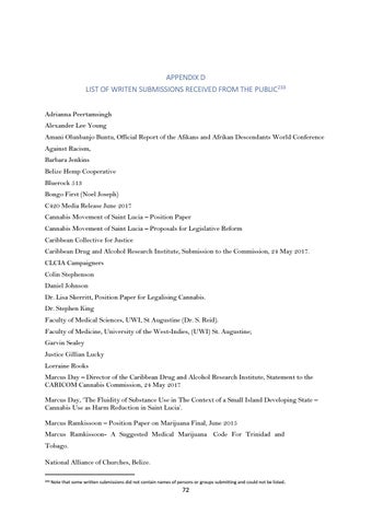 APPENDIX D LIST OF WRITEN SUBMISSIONS RECEIVED FROM THE PUBLIC233 Adrianna Peertamsingh Alexander Lee Young Amani Olunbanjo Buntu, Official Report of the Afikans and Afrikan Descendants World Conference Against Racism, Barbara Jenkins Belize Hemp Cooperative Bluerock 513 Bongo First (Noel Joseph) C420 Media Release June 2017 Cannabis Movement of Saint Lucia – Position Paper Cannabis Movement of Saint Lucia – Proposals for Legislative Reform Caribbean Collective for Justice Caribbean Drug and Alcohol Research Institute, Submission to the Commission, 24 May 2017. CLCIA Campaigners Colin Stephenson Daniel Johnson Dr. Lisa Skerritt, Position Paper for Legalising Cannabis. Dr. Stephen King Faculty of Medical Sciences, UWI, St Augustine (Dr. S. Reid). Faculty of Medicine, University of the West-Indies, (UWI) St. Augustine; Garvin Sealey Justice Gillian Lucky Lorraine Rooks Marcus Day – Director of the Caribbean Drug and Alcohol Research Institute, Statement to the CARICOM Cannabis Commission, 24 May 2017 Marcus Day, ‘The Fluidity of Substance Use in The Context of a Small Island Developing State – Cannabis Use as Harm Reduction in Saint Lucia’. Marcus Ramkissoon – Position Paper on Marijuana Final, June 2015 Marcus Ramkissoon- A Suggested Medical Marijuana Code For Trinidad and Tobago. National Alliance of Churches, Belize. 233