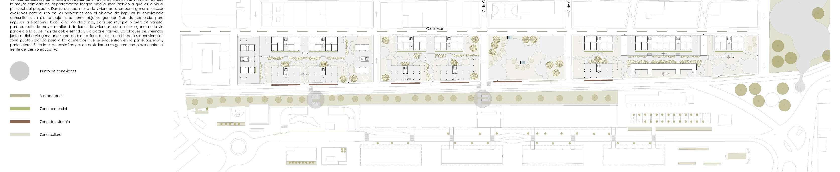 Ubicado en Tarragona, España se realiza una propuesta de intervención urbana y de vivienda social, con la intención de comunicar directamente con el muelle de la ciudad. Se desarrolla cuatro tipos de tipologías. Lo que se trató de destacar en este proyecto es la ventilación cruzada de las viviendas.