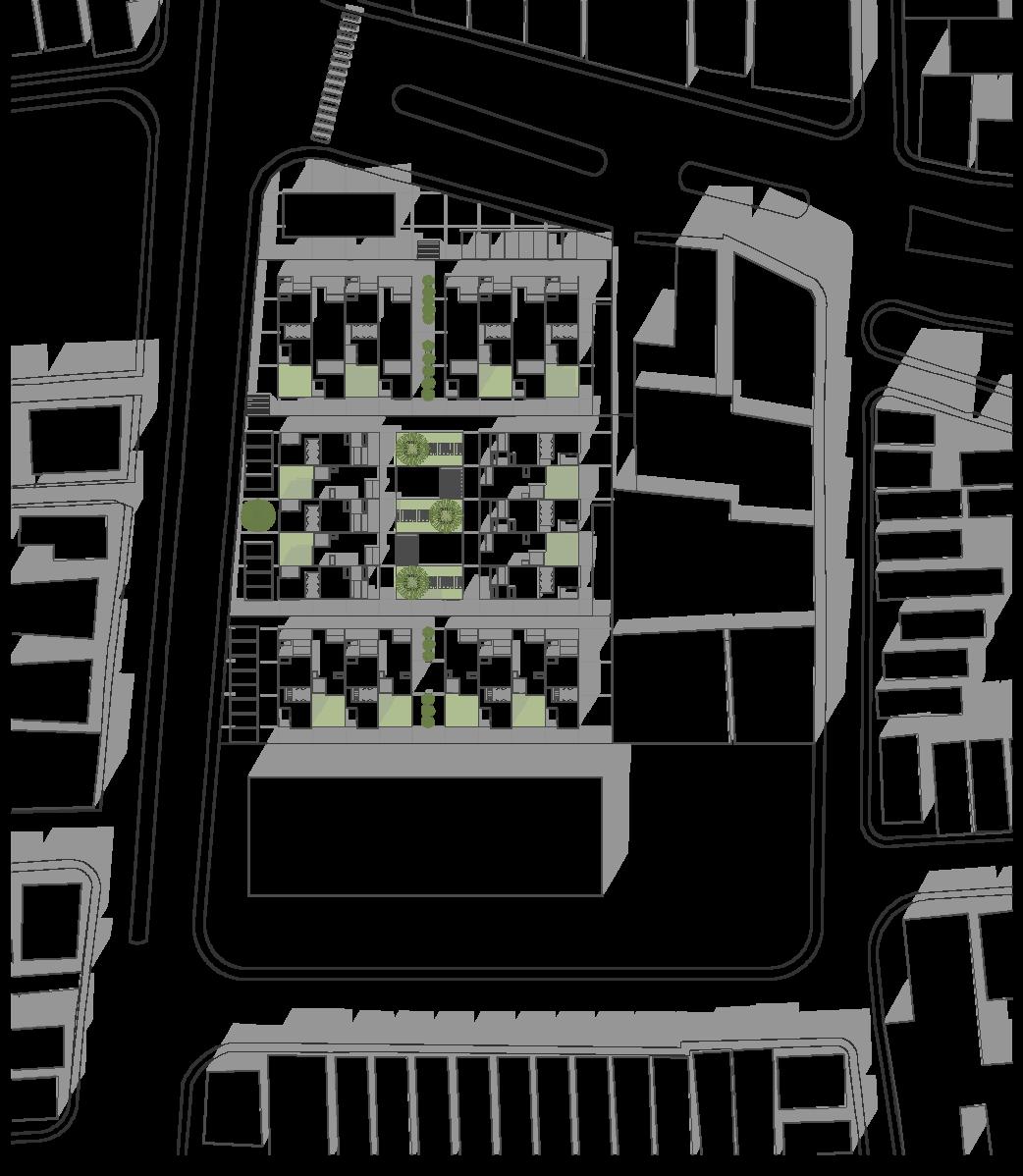 Ubicado en Cuenca, Ecuador se realiza una propuesta de diseño de conjunto de viviendas distribuidas en tres terrazas para adaptar a la pendiente del terreno. El conjunto cuenta con tres tipologías: 2 dormitorios, 3 dormitorios y 4 dormitorios; cada vivienda tiene patio interno con la intención de mantener la privacidad de la habitante.