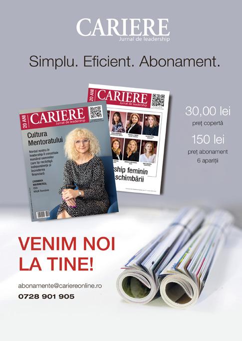 Cititorii se pot abona pe site-ul www.revistacariere.ro/abonamente la tel. 0728.901.905, la e-mail dorin.cozma@cariereonline.ro și prin: Manpres Distribution la abonamente@manpres.ro, Top Seven West la office@abonamente-presa.ro.