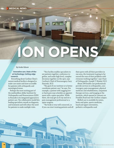 their parts with all their providers in one area, the treatment is going to far exceed the sum of their problems with everyone working together,” says Chair of Orthopaedics Joseph T. Moskal, M.D. About 200 health care professionals provide services in orthopaedics, neurosurgery, pain management, physical medicine and rehabilitation, outpatient therapy services, and imaging at the institute, which opened in January on Franklin Road near the Carilion campus. Skilled care is available for joints, brain and spine, sports medicine, hand and upper extremities, pediatric orthopaedics and