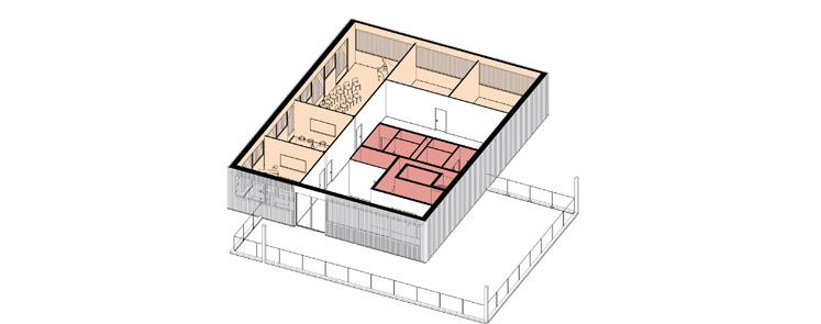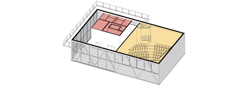 Légende : Circulations centrales Gazi - Un QUartier CUltUrel Portée 26 Juin 2023 S10 PFE Musicothérapie Adulte Musicothérapie Enfant Terasse accessible Amphithéâtre Salles de répétition Accueil Magasin de Musique Atelier Luthier Restaurant Cuisines Vestiaires Stockage Lobby Axonométrie Programmatique Salle de Restaurant Accueil Salle de Répétition Amphithéâtre Musicothérapie 13