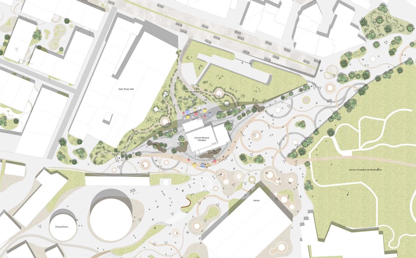 Projet Urbain dans le quartier de Gazi à Athènes Espaces extérieurs de l’école de Musique Place Perséphone