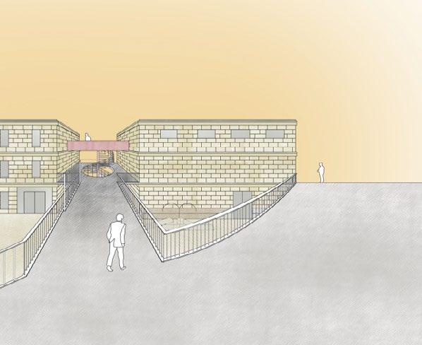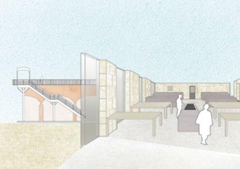 Je viens aussi ouvrir la tôle en toiture côté nord pour offrir une lumière zénithale à l’étage. Le jardin central comprend un second bassin de rétention qui devient un parcours de rivière intérieure où les poissons pourraient proliférer. Cette halle industrielle est divisée en trois espaces, qui reprennent la trame des ateliers en brique. Cela distingue alors trois pratiques, le lieu de restauration, l’espace calme central avec une hauteur basse sous plafond imposée par la mezzanine et pour finir l’espace de pratique. C’est sur un système de double mur que vient s’insérer l’escalier, qui devient un jeu d’épaisseur pour les enfants. La seconde mezzanine relie les deux bâtiments à l’aide d’une passerelle et donne sur la terrasse suspendue sur la place centrale. Cette dernière rejoint la passerelle du bâtiment qui propose un autre domaine d’étude, le mouvement du corps.